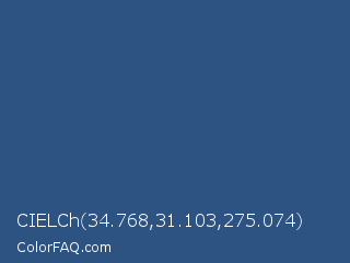 CIELCh 34.768,31.103,275.074 Color is a normal blue color and the nearest color is Chambray #354e8c. Hex code #2d5383 and RGB value is rgb(45,83,131). In RGB color space, this color is composed of 18% red, 33% green, 51% blue, In CMYK color space, this color is composed of 66% cyan, 37% magenta, 0% yellow , 49% black , In HSL color space, this color has a hue angle of 213° , 49% saturation and 35% lightness.