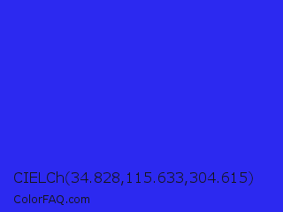 CIELCh 34.828,115.633,304.615 Color is a normal indigo color and the nearest color is Bluebonnet #1c1cf0. Hex code #2c29f0 and RGB value is rgb(44,41,240). In RGB color space, this color is composed of 17% red, 16% green, 94% blue, In CMYK color space, this color is composed of 82% cyan, 83% magenta, 0% yellow , 6% black , In HSL color space, this color has a hue angle of 241° , 87% saturation and 55% lightness.