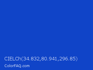 CIELCh 34.832,80.941,296.85 Color is a normal blue color and the nearest color is Sapphire #0f52ba. Hex code #1044c8 and RGB value is rgb(16,68,200). In RGB color space, this color is composed of 6% red, 27% green, 78% blue, In CMYK color space, this color is composed of 92% cyan, 66% magenta, 0% yellow , 22% black , In HSL color space, this color has a hue angle of 223° , 85% saturation and 42% lightness.