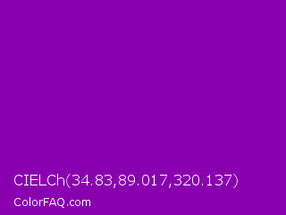 CIELCh 34.83,89.017,320.137 Color is a normal purple color and the nearest color is Violet RYB #8601af. Hex code #8900af and RGB value is rgb(137,0,175). In RGB color space, this color is composed of 54% red, 0% green, 69% blue, In CMYK color space, this color is composed of 22% cyan, 100% magenta, 0% yellow , 31% black , In HSL color space, this color has a hue angle of 287° , 100% saturation and 34% lightness.