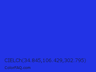 CIELCh 34.845,106.429,302.795 Color is a normal blue color and the nearest color is Palatinate Blue #273be2. Hex code #2233e6 and RGB value is rgb(34,51,230). In RGB color space, this color is composed of 13% red, 20% green, 90% blue, In CMYK color space, this color is composed of 85% cyan, 78% magenta, 0% yellow , 10% black , In HSL color space, this color has a hue angle of 235° , 80% saturation and 52% lightness.