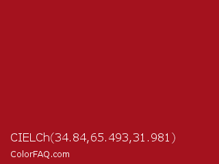 CIELCh 34.84,65.493,31.981 Color is a normal red color and the nearest color is Ruby Red #9b111e. Hex code #a4121e and RGB value is rgb(164,18,30). In RGB color space, this color is composed of 64% red, 7% green, 12% blue, In CMYK color space, this color is composed of 0% cyan, 89% magenta, 82% yellow , 36% black , In HSL color space, this color has a hue angle of 355° , 80% saturation and 36% lightness.