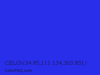 CIELCh 34.85,111.134,303.851 Color is a normal blue color and the nearest color is Palatinate Blue #273be2. Hex code #292eeb and RGB value is rgb(41,46,235). In RGB color space, this color is composed of 16% red, 18% green, 92% blue, In CMYK color space, this color is composed of 83% cyan, 80% magenta, 0% yellow , 8% black , In HSL color space, this color has a hue angle of 238° , 83% saturation and 54% lightness.