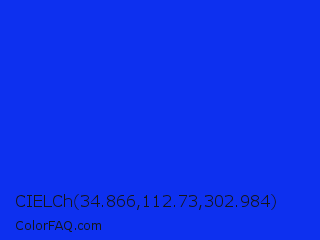CIELCh 34.866,112.73,302.984 Color is a normal blue color and the nearest color is Bluebonnet #1c1cf0. Hex code #0d30ef and RGB value is rgb(13,48,239). In RGB color space, this color is composed of 5% red, 19% green, 94% blue, In CMYK color space, this color is composed of 95% cyan, 80% magenta, 0% yellow , 6% black , In HSL color space, this color has a hue angle of 231° , 90% saturation and 49% lightness.