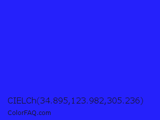 CIELCh 34.895,123.982,305.236 Color is a normal indigo color and the nearest color is Bluebonnet #1c1cf0. Hex code #2521fb and RGB value is rgb(37,33,251). In RGB color space, this color is composed of 15% red, 13% green, 98% blue, In CMYK color space, this color is composed of 85% cyan, 87% magenta, 0% yellow , 2% black , In HSL color space, this color has a hue angle of 241° , 96% saturation and 56% lightness.