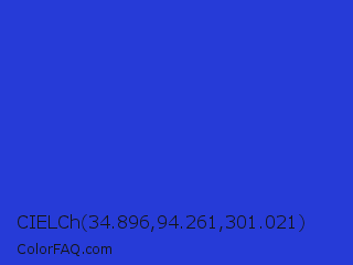 CIELCh 34.896,94.261,301.021 Color is a normal blue color and the nearest color is Palatinate Blue #273be2. Hex code #263bd7 and RGB value is rgb(38,59,215). In RGB color space, this color is composed of 15% red, 23% green, 84% blue, In CMYK color space, this color is composed of 82% cyan, 73% magenta, 0% yellow , 16% black , In HSL color space, this color has a hue angle of 233° , 70% saturation and 50% lightness.
