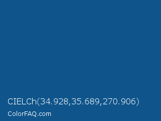 CIELCh 34.928,35.689,270.906 Color is a dark blue color and the nearest color is Yale Blue #0f4d92. Hex code #0f558b and RGB value is rgb(15,85,139). In RGB color space, this color is composed of 6% red, 33% green, 55% blue, In CMYK color space, this color is composed of 89% cyan, 39% magenta, 0% yellow , 45% black , In HSL color space, this color has a hue angle of 206° , 81% saturation and 30% lightness.