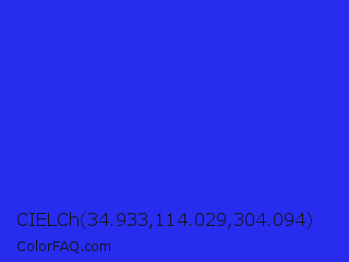CIELCh 34.933,114.029,304.094 Color is a normal blue color and the nearest color is Bluebonnet #1c1cf0. Hex code #272cef and RGB value is rgb(39,44,239). In RGB color space, this color is composed of 15% red, 17% green, 94% blue, In CMYK color space, this color is composed of 84% cyan, 82% magenta, 0% yellow , 6% black , In HSL color space, this color has a hue angle of 239° , 86% saturation and 55% lightness.