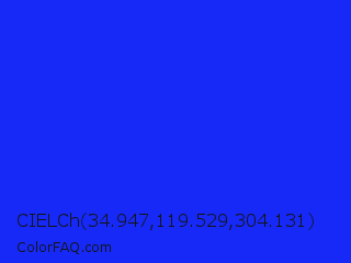 CIELCh 34.947,119.529,304.131 Color is a normal blue color and the nearest color is Bluebonnet #1c1cf0. Hex code #1629f7 and RGB value is rgb(22,41,247). In RGB color space, this color is composed of 9% red, 16% green, 97% blue, In CMYK color space, this color is composed of 91% cyan, 83% magenta, 0% yellow , 3% black , In HSL color space, this color has a hue angle of 235° , 93% saturation and 53% lightness.