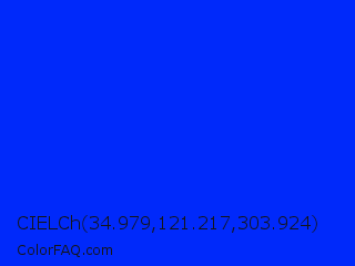 CIELCh 34.979,121.217,303.924 Color is a normal blue color and the nearest color is Blue RYB #0247fe. Hex code #0029fa and RGB value is rgb(0,41,250). In RGB color space, this color is composed of 0% red, 16% green, 98% blue, In CMYK color space, this color is composed of 100% cyan, 84% magenta, 0% yellow , 2% black , In HSL color space, this color has a hue angle of 230° , 100% saturation and 49% lightness.