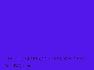 CIELCh 34.995,117.009,308.183 Color is a normal indigo color and the nearest color is Han Purple #5218fa. Hex code #5417eb and RGB value is rgb(84,23,235). In RGB color space, this color is composed of 33% red, 9% green, 92% blue, In CMYK color space, this color is composed of 64% cyan, 90% magenta, 0% yellow , 8% black , In HSL color space, this color has a hue angle of 257° , 84% saturation and 51% lightness.