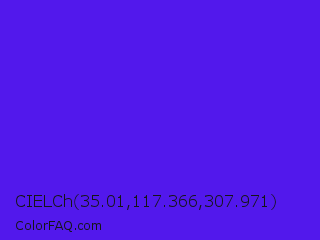 CIELCh 35.01,117.366,307.971 Color is a normal indigo color and the nearest color is Han Purple #5218fa. Hex code #5218ec and RGB value is rgb(82,24,236). In RGB color space, this color is composed of 32% red, 9% green, 93% blue, In CMYK color space, this color is composed of 65% cyan, 90% magenta, 0% yellow , 7% black , In HSL color space, this color has a hue angle of 256° , 85% saturation and 51% lightness.