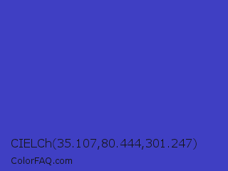 CIELCh 35.107,80.444,301.247 Color is a normal blue color and the nearest color is Ocean Blue #4f42b5. Hex code #3f3fc3 and RGB value is rgb(63,63,195). In RGB color space, this color is composed of 25% red, 25% green, 76% blue, In CMYK color space, this color is composed of 68% cyan, 68% magenta, 0% yellow , 24% black , In HSL color space, this color has a hue angle of 240° , 52% saturation and 51% lightness.