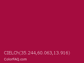CIELCh 35.244,60.063,13.916 Color is a normal rose color and the nearest color is Shiraz #b20931. Hex code #a50c3f and RGB value is rgb(165,12,63). In RGB color space, this color is composed of 65% red, 5% green, 25% blue, In CMYK color space, this color is composed of 0% cyan, 93% magenta, 62% yellow , 35% black , In HSL color space, this color has a hue angle of 340° , 86% saturation and 35% lightness.