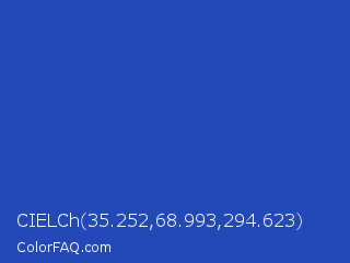 CIELCh 35.252,68.993,294.623 Color is a normal blue color and the nearest color is Denim Blue #2243b6. Hex code #2349b9 and RGB value is rgb(35,73,185). In RGB color space, this color is composed of 14% red, 29% green, 73% blue, In CMYK color space, this color is composed of 81% cyan, 61% magenta, 0% yellow , 27% black , In HSL color space, this color has a hue angle of 225° , 68% saturation and 43% lightness.