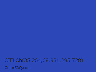 CIELCh 35.264,68.931,295.728 Color is a normal blue color and the nearest color is Violet Blue #324ab2. Hex code #2c48b8 and RGB value is rgb(44,72,184). In RGB color space, this color is composed of 17% red, 28% green, 72% blue, In CMYK color space, this color is composed of 76% cyan, 61% magenta, 0% yellow , 28% black , In HSL color space, this color has a hue angle of 228° , 61% saturation and 45% lightness.