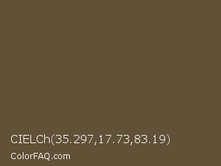 CIELCh 35.297,17.73,83.19 Color is a dark orange color and the nearest color is Kabul #5e483e. Hex code #605137 and RGB value is rgb(96,81,55). In RGB color space, this color is composed of 38% red, 32% green, 22% blue, In CMYK color space, this color is composed of 0% cyan, 16% magenta, 43% yellow , 62% black , In HSL color space, this color has a hue angle of 38° , 27% saturation and 30% lightness.