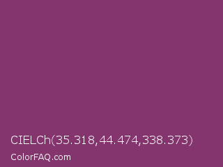 CIELCh 35.318,44.474,338.373 Color is a normal magenta color and the nearest color is Razzmic Berry Crayola #843179. Hex code #85356e and RGB value is rgb(133,53,110). In RGB color space, this color is composed of 52% red, 21% green, 43% blue, In CMYK color space, this color is composed of 0% cyan, 60% magenta, 17% yellow , 48% black , In HSL color space, this color has a hue angle of 317° , 43% saturation and 36% lightness.