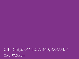 CIELCh 35.411,57.349,323.945 Color is a normal magenta color and the nearest color is Vivid Violet #803790. Hex code #80328a and RGB value is rgb(128,50,138). In RGB color space, this color is composed of 50% red, 20% green, 54% blue, In CMYK color space, this color is composed of 7% cyan, 64% magenta, 0% yellow , 46% black , In HSL color space, this color has a hue angle of 293° , 47% saturation and 37% lightness.