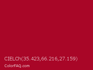 CIELCh 35.423,66.216,27.159 Color is a normal red color and the nearest color is Alabama Crimson #af002a. Hex code #a90627 and RGB value is rgb(169,6,39). In RGB color space, this color is composed of 66% red, 2% green, 15% blue, In CMYK color space, this color is composed of 0% cyan, 96% magenta, 77% yellow , 34% black , In HSL color space, this color has a hue angle of 348° , 93% saturation and 34% lightness.