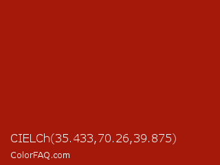 CIELCh 35.433,70.26,39.875 Color is a normal red color and the nearest color is Rufous #a81c07. Hex code #a5190a and RGB value is rgb(165,25,10). In RGB color space, this color is composed of 65% red, 10% green, 4% blue, In CMYK color space, this color is composed of 0% cyan, 85% magenta, 94% yellow , 35% black , In HSL color space, this color has a hue angle of 6° , 89% saturation and 34% lightness.