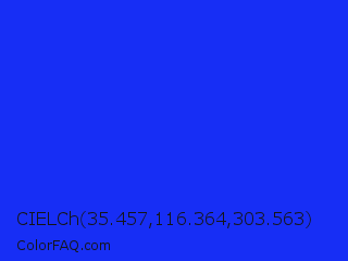 CIELCh 35.457,116.364,303.563 Color is a normal blue color and the nearest color is Bluebonnet #1c1cf0. Hex code #172ef5 and RGB value is rgb(23,46,245). In RGB color space, this color is composed of 9% red, 18% green, 96% blue, In CMYK color space, this color is composed of 91% cyan, 81% magenta, 0% yellow , 4% black , In HSL color space, this color has a hue angle of 234° , 92% saturation and 53% lightness.