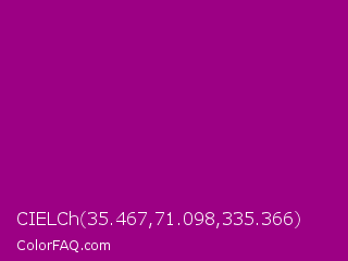 CIELCh 35.467,71.098,335.366 Color is a normal magenta color and the nearest color is Dark Magenta #8b008b. Hex code #9c0084 and RGB value is rgb(156,0,132). In RGB color space, this color is composed of 61% red, 0% green, 52% blue, In CMYK color space, this color is composed of 0% cyan, 100% magenta, 15% yellow , 39% black , In HSL color space, this color has a hue angle of 309° , 100% saturation and 31% lightness.