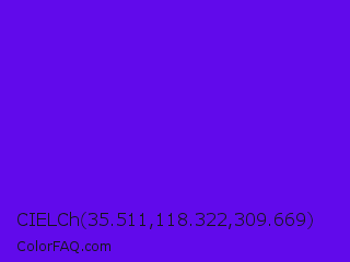 CIELCh 35.511,118.322,309.669 Color is a normal violet color and the nearest color is Han Purple #5218fa. Hex code #610aeb and RGB value is rgb(97,10,235). In RGB color space, this color is composed of 38% red, 4% green, 92% blue, In CMYK color space, this color is composed of 59% cyan, 96% magenta, 0% yellow , 8% black , In HSL color space, this color has a hue angle of 263° , 92% saturation and 48% lightness.
