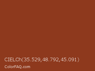 CIELCh 35.529,48.792,45.091 Color is a normal color and the nearest color is Burnt Umber #8a3324. Hex code #8e391d and RGB value is rgb(142,57,29). In RGB color space, this color is composed of 56% red, 22% green, 11% blue, In CMYK color space, this color is composed of 0% cyan, 60% magenta, 80% yellow , 44% black , In HSL color space, this color has a hue angle of 15° , 66% saturation and 34% lightness.