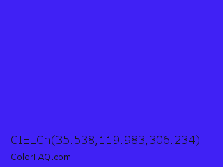 CIELCh 35.538,119.983,306.234 Color is a normal indigo color and the nearest color is Han Purple #5218fa. Hex code #4021f5 and RGB value is rgb(64,33,245). In RGB color space, this color is composed of 25% red, 13% green, 96% blue, In CMYK color space, this color is composed of 74% cyan, 87% magenta, 0% yellow , 4% black , In HSL color space, this color has a hue angle of 249° , 91% saturation and 55% lightness.