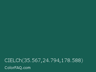 CIELCh 35.567,24.794,178.588 Color is a dark cyan color and the nearest color is Eden #105852. Hex code #165e52 and RGB value is rgb(22,94,82). In RGB color space, this color is composed of 9% red, 37% green, 32% blue, In CMYK color space, this color is composed of 77% cyan, 0% magenta, 13% yellow , 63% black , In HSL color space, this color has a hue angle of 170° , 62% saturation and 23% lightness.