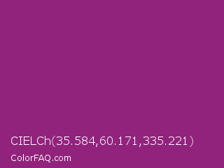 CIELCh 35.584,60.171,335.221 Color is a normal magenta color and the nearest color is Razzmic Berry Crayola #843179. Hex code #92237d and RGB value is rgb(146,35,125). In RGB color space, this color is composed of 57% red, 14% green, 49% blue, In CMYK color space, this color is composed of 0% cyan, 76% magenta, 14% yellow , 43% black , In HSL color space, this color has a hue angle of 311° , 61% saturation and 35% lightness.