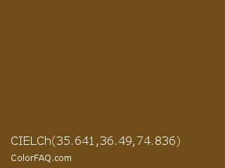 CIELCh 35.641,36.49,74.836 Color is a dark orange color and the nearest color is Raw Umber #734a12. Hex code #704d19 and RGB value is rgb(112,77,25). In RGB color space, this color is composed of 44% red, 30% green, 10% blue, In CMYK color space, this color is composed of 0% cyan, 31% magenta, 78% yellow , 56% black , In HSL color space, this color has a hue angle of 36° , 64% saturation and 27% lightness.