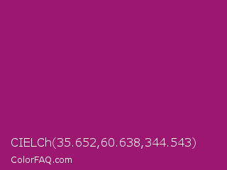 CIELCh 35.652,60.638,344.543 Color is a normal magenta color and the nearest color is Amaranth Deep Purple #9f2b68. Hex code #9c176f and RGB value is rgb(156,23,111). In RGB color space, this color is composed of 61% red, 9% green, 44% blue, In CMYK color space, this color is composed of 0% cyan, 85% magenta, 29% yellow , 39% black , In HSL color space, this color has a hue angle of 320° , 74% saturation and 35% lightness.