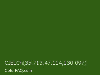 CIELCh 35.713,47.114,130.097 Color is a very dark green color and the nearest color is Dell #396413. Hex code #305f13 and RGB value is rgb(48,95,19). In RGB color space, this color is composed of 19% red, 37% green, 7% blue, In CMYK color space, this color is composed of 49% cyan, 0% magenta, 80% yellow , 63% black , In HSL color space, this color has a hue angle of 97° , 67% saturation and 22% lightness.