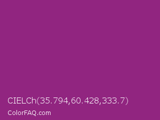 CIELCh 35.794,60.428,333.7 Color is a normal magenta color and the nearest color is Razzmic Berry Crayola #843179. Hex code #912580 and RGB value is rgb(145,37,128). In RGB color space, this color is composed of 57% red, 15% green, 50% blue, In CMYK color space, this color is composed of 0% cyan, 74% magenta, 12% yellow , 43% black , In HSL color space, this color has a hue angle of 309° , 59% saturation and 36% lightness.