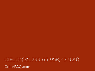 CIELCh 35.799,65.958,43.929 Color is a normal red color and the nearest color is Tabasco #a02712. Hex code #9f2807 and RGB value is rgb(159,40,7). In RGB color space, this color is composed of 62% red, 16% green, 3% blue, In CMYK color space, this color is composed of 0% cyan, 75% magenta, 96% yellow , 38% black , In HSL color space, this color has a hue angle of 13° , 92% saturation and 33% lightness.
