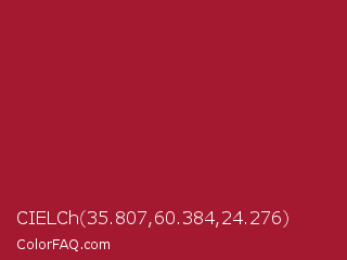 CIELCh 35.807,60.384,24.276 Color is a normal red color and the nearest color is Vivid Burgundy #9f1d35. Hex code #a51930 and RGB value is rgb(165,25,48). In RGB color space, this color is composed of 65% red, 10% green, 19% blue, In CMYK color space, this color is composed of 0% cyan, 85% magenta, 71% yellow , 35% black , In HSL color space, this color has a hue angle of 350° , 74% saturation and 37% lightness.