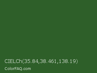 CIELCh 35.84,38.461,138.19 Color is a dark green color and the nearest color is Mughal Green #306030. Hex code #2e5f29 and RGB value is rgb(46,95,41). In RGB color space, this color is composed of 18% red, 37% green, 16% blue, In CMYK color space, this color is composed of 52% cyan, 0% magenta, 57% yellow , 63% black , In HSL color space, this color has a hue angle of 114° , 40% saturation and 27% lightness.