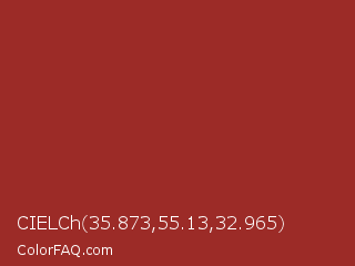 CIELCh 35.873,55.13,32.965 Color is a normal red color and the nearest color is Red Brown #a52a2a. Hex code #9c2b27 and RGB value is rgb(156,43,39). In RGB color space, this color is composed of 61% red, 17% green, 15% blue, In CMYK color space, this color is composed of 0% cyan, 72% magenta, 75% yellow , 39% black , In HSL color space, this color has a hue angle of 2° , 60% saturation and 38% lightness.