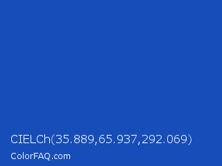 CIELCh 35.889,65.937,292.069 Color is a normal blue color and the nearest color is Sapphire #0f52ba. Hex code #174db8 and RGB value is rgb(23,77,184). In RGB color space, this color is composed of 9% red, 30% green, 72% blue, In CMYK color space, this color is composed of 88% cyan, 58% magenta, 0% yellow , 28% black , In HSL color space, this color has a hue angle of 220° , 78% saturation and 41% lightness.