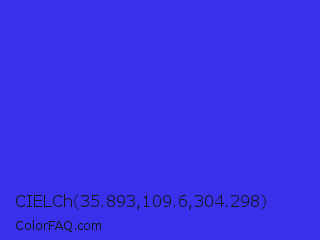 CIELCh 35.893,109.6,304.298 Color is a normal indigo color and the nearest color is Palatinate Blue #273be2. Hex code #3830eb and RGB value is rgb(56,48,235). In RGB color space, this color is composed of 22% red, 19% green, 92% blue, In CMYK color space, this color is composed of 76% cyan, 80% magenta, 0% yellow , 8% black , In HSL color space, this color has a hue angle of 243° , 82% saturation and 55% lightness.
