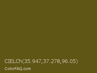 CIELCh 35.947,37.278,96.05 Color is a dark yellow color and the nearest color is West Coast #625119. Hex code #5f5514 and RGB value is rgb(95,85,20). In RGB color space, this color is composed of 37% red, 33% green, 8% blue, In CMYK color space, this color is composed of 0% cyan, 11% magenta, 79% yellow , 63% black , In HSL color space, this color has a hue angle of 52° , 65% saturation and 23% lightness.