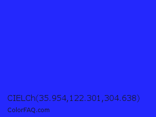 CIELCh 35.954,122.301,304.638 Color is a normal blue color and the nearest color is Bluebonnet #1c1cf0. Hex code #2428fd and RGB value is rgb(36,40,253). In RGB color space, this color is composed of 14% red, 16% green, 99% blue, In CMYK color space, this color is composed of 86% cyan, 84% magenta, 0% yellow , 1% black , In HSL color space, this color has a hue angle of 239° , 98% saturation and 57% lightness.