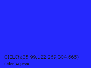 CIELCh 35.99,122.269,304.665 Color is a normal blue color and the nearest color is Bluebonnet #1c1cf0. Hex code #2528fd and RGB value is rgb(37,40,253). In RGB color space, this color is composed of 15% red, 16% green, 99% blue, In CMYK color space, this color is composed of 85% cyan, 84% magenta, 0% yellow , 1% black , In HSL color space, this color has a hue angle of 239° , 98% saturation and 57% lightness.