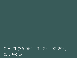CIELCh 36.069,13.427,192.294 Color is a dark cyan color and the nearest color is Spectra #2f5a57. Hex code #385b59 and RGB value is rgb(56,91,89). In RGB color space, this color is composed of 22% red, 36% green, 35% blue, In CMYK color space, this color is composed of 38% cyan, 0% magenta, 2% yellow , 64% black , In HSL color space, this color has a hue angle of 177° , 24% saturation and 29% lightness.