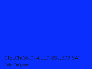 CIELCh 36.074,119.831,303.54 Color is a normal blue color and the nearest color is Blue RYB #0247fe. Hex code #0a2efc and RGB value is rgb(10,46,252). In RGB color space, this color is composed of 4% red, 18% green, 99% blue, In CMYK color space, this color is composed of 96% cyan, 82% magenta, 0% yellow , 1% black , In HSL color space, this color has a hue angle of 231° , 98% saturation and 51% lightness.
