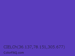 CIELCh 36.137,78.151,305.677 Color is a normal indigo color and the nearest color is Ocean Blue #4f42b5. Hex code #5a3cbd and RGB value is rgb(90,60,189). In RGB color space, this color is composed of 35% red, 24% green, 74% blue, In CMYK color space, this color is composed of 52% cyan, 68% magenta, 0% yellow , 26% black , In HSL color space, this color has a hue angle of 254° , 52% saturation and 49% lightness.