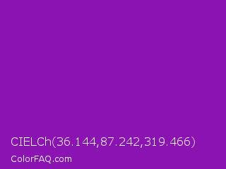 CIELCh 36.144,87.242,319.466 Color is a normal purple color and the nearest color is Violet RYB #8601af. Hex code #8a13b2 and RGB value is rgb(138,19,178). In RGB color space, this color is composed of 54% red, 7% green, 70% blue, In CMYK color space, this color is composed of 22% cyan, 89% magenta, 0% yellow , 30% black , In HSL color space, this color has a hue angle of 285° , 81% saturation and 39% lightness.