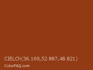CIELCh 36.169,52.887,48.821 Color is a normal orange color and the nearest color is Saddle Brown #8b4513. Hex code #913a14 and RGB value is rgb(145,58,20). In RGB color space, this color is composed of 57% red, 23% green, 8% blue, In CMYK color space, this color is composed of 0% cyan, 60% magenta, 86% yellow , 43% black , In HSL color space, this color has a hue angle of 18° , 76% saturation and 32% lightness.